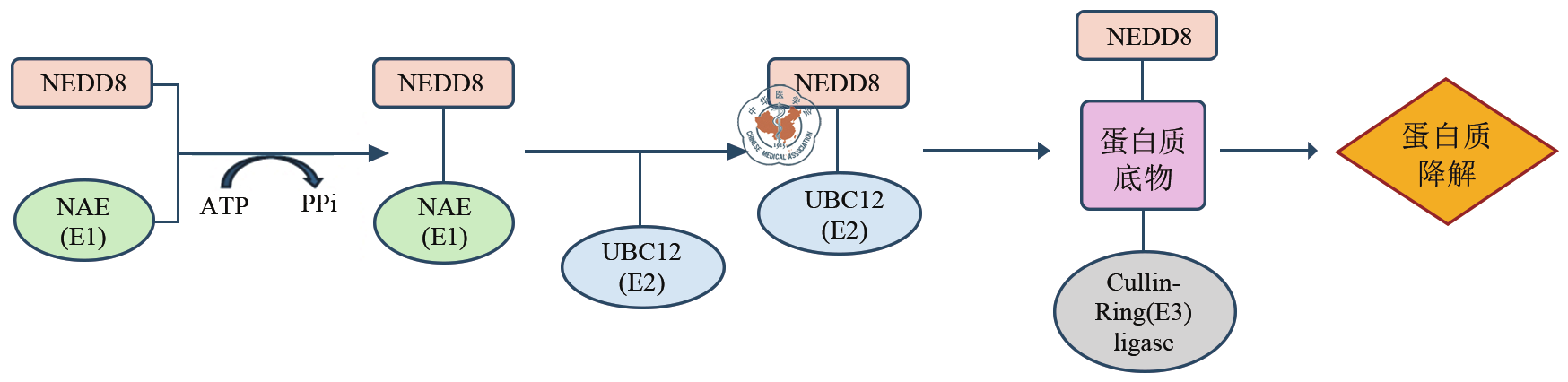 图1 类泛素化过程注:NEDD8为神经的前体细胞表达发育性下调8因子;NAE为NEDD8激活酶;UBC12为泛素结合酶12;Cullin-Ring ligase为Cullin-Ring泛素连接酶
